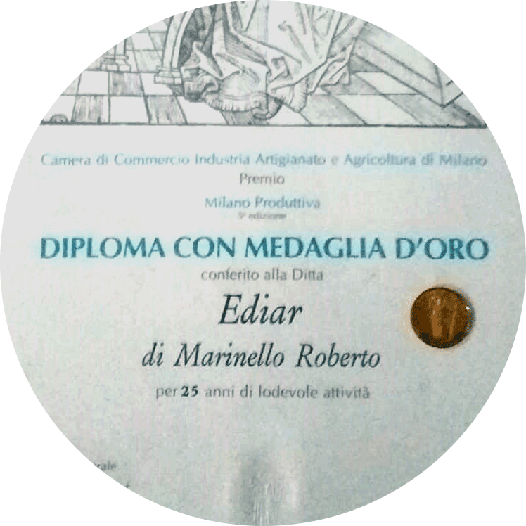 E' con grande orgoglio che la Ediar riceve il diploma e la medaglia d'oro per onorare 25 anni di lodevole attività.
